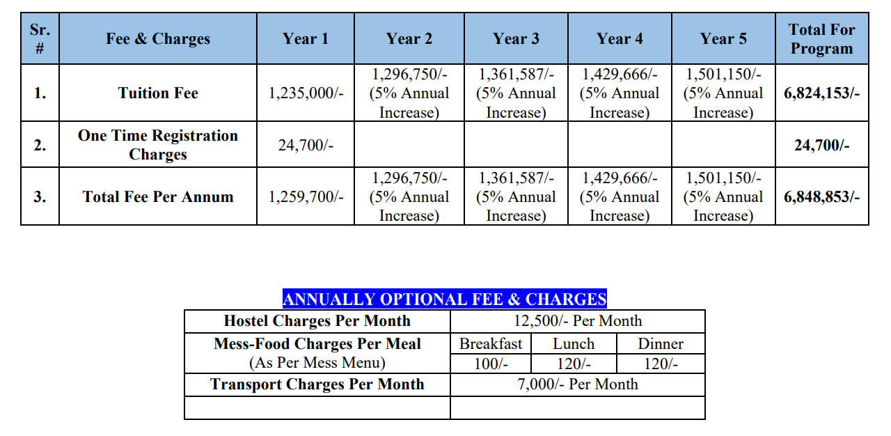 1.Advance withholding tax on tuition fee will be charged separately according to the FBR rules, if applicable.